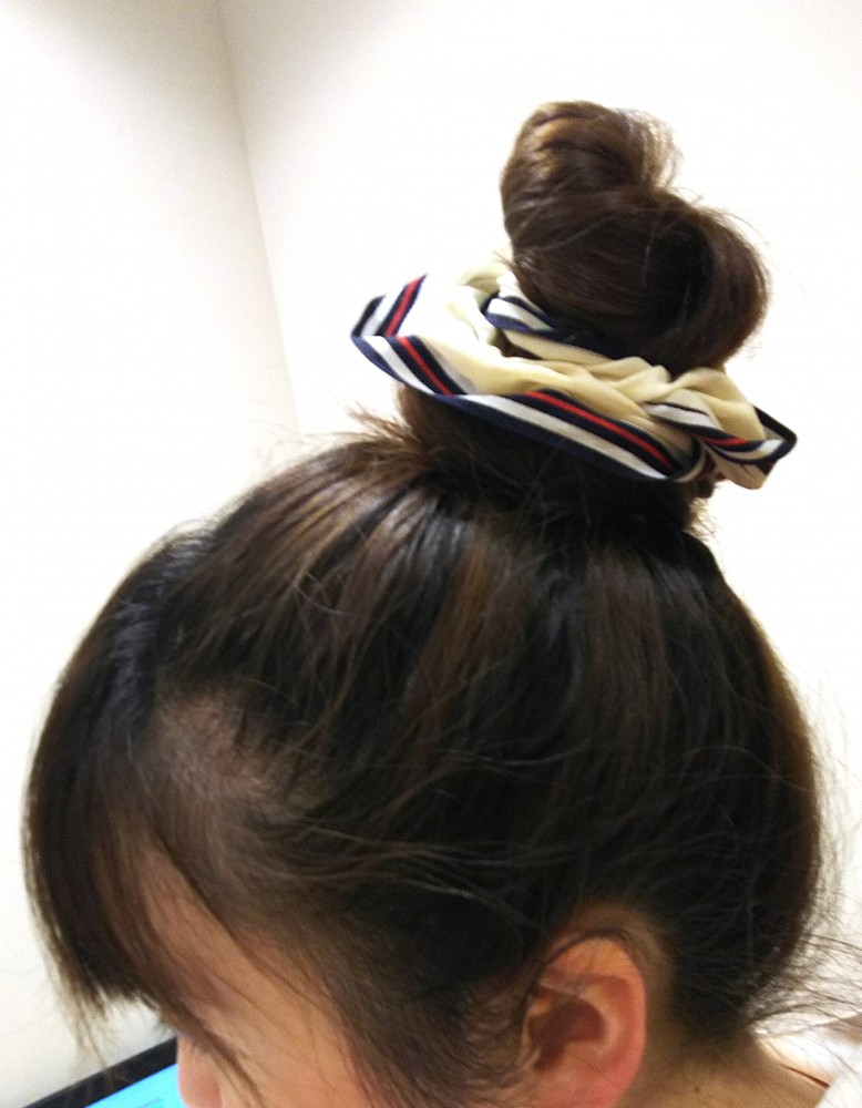 ポニーテールを根元に巻き付けてシュシュで留めているだけなので、とっても簡単^^