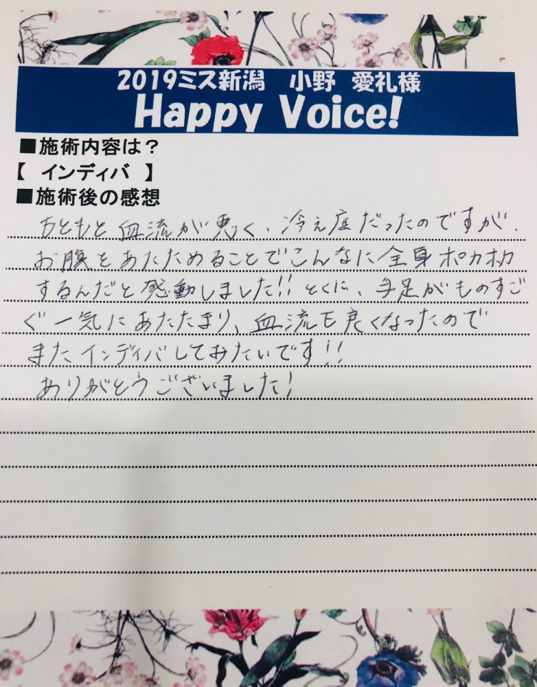 昨年度のベストオブミス新潟大会で代表に選ばれた皆さんには昨冬に腹部のインディバ®を体験していただきましたが、