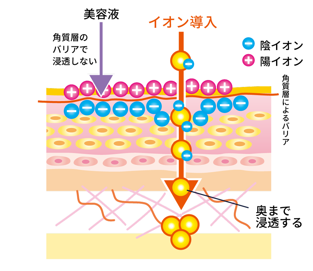 直接お肌に塗布するだけではなく、お肌の深部まで送り込んでくれるイオン導入をすることによって、吸収率が格段に高くなるのです!
