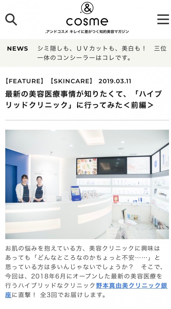 野本真由美クリニック銀座が 知的美容マガジンの「.&cosme(アンドコスメ)」にて連日掲載されております。