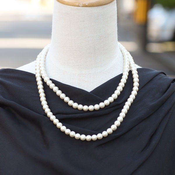 襟元の開いたトップスを着用した時に首元にパールの目がいくので、上品で華やかなスタイリングに。