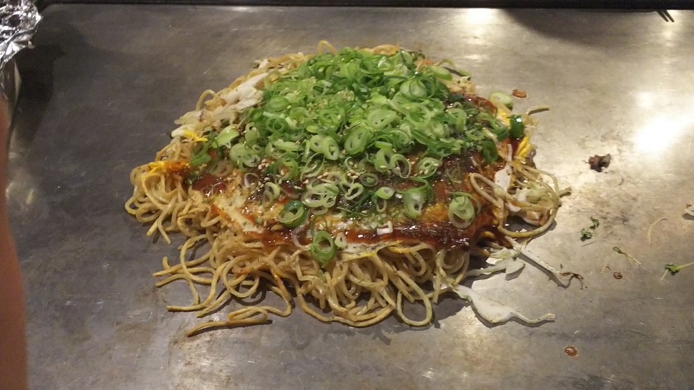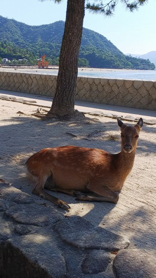 ちょっと暗いですがカメラ目線の鹿さん(遠くには鳥居)と、おいしかったお好み焼きです^^