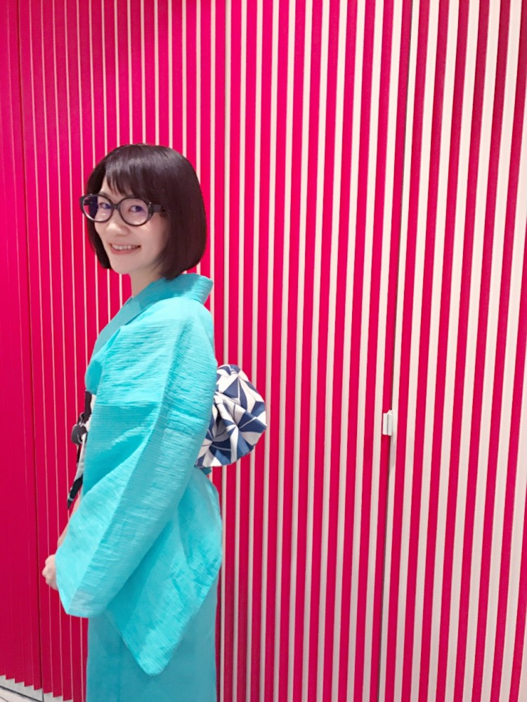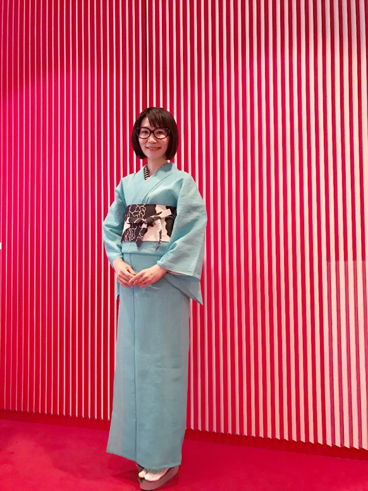 まず驚いたのは、院長のお着物。彩度高めのブルーの小千谷縮です。
