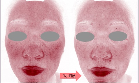 赤み画像を見てみますと、肝斑のラインが薄くなっており、皮膚の炎症が軽減されています。