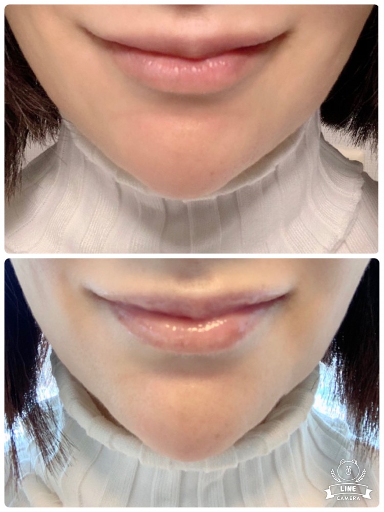 寝る前にリップを外用して(写真上)、12時間後(下)と比較した写真です。