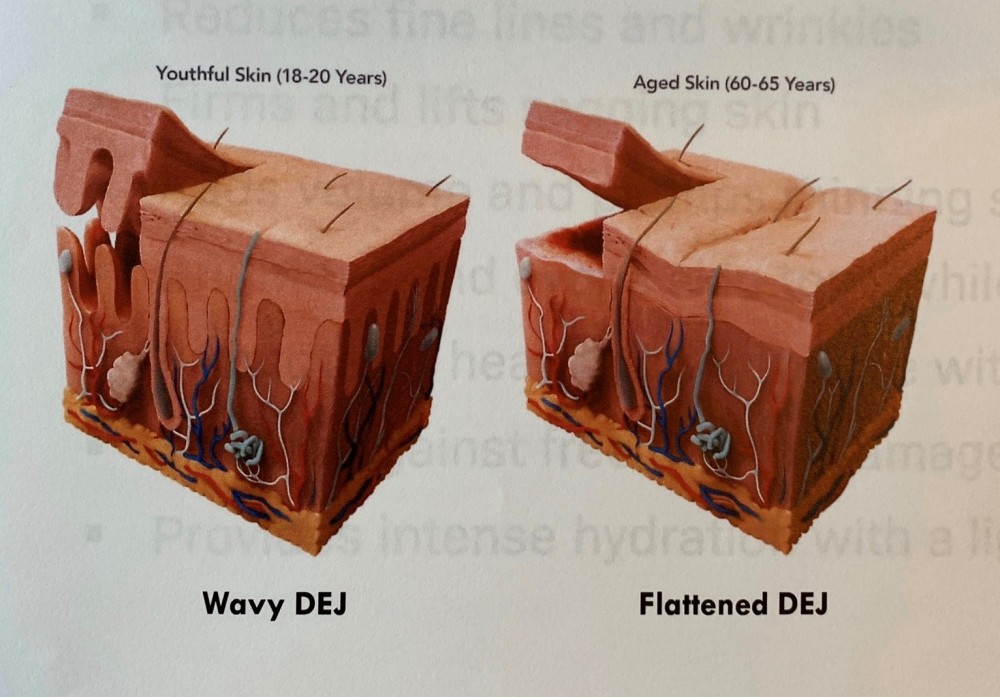DEJは加齢とともにウエーブが平坦化し皮膚の構造が変化してきます。(右側の図のように)