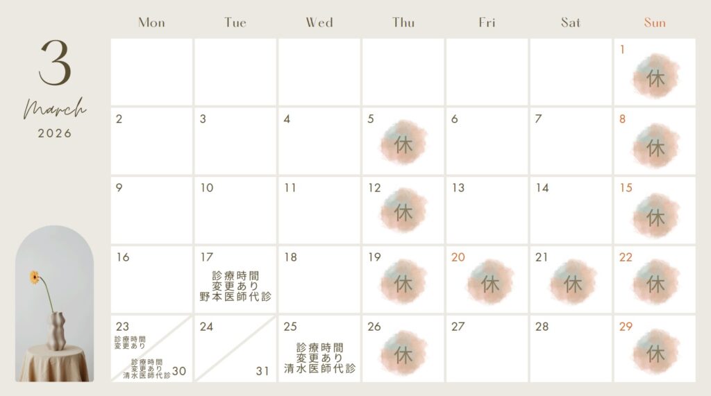・ 3月25日(水) 診察:14時から17時(最終受付時間:16時) 清水医師代診